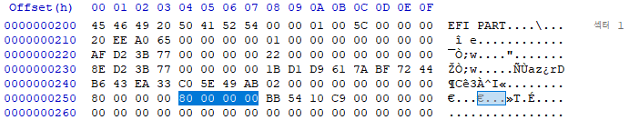 Hex 데이터를 보는 방법은 기존의 MBR과 동일 합니다.