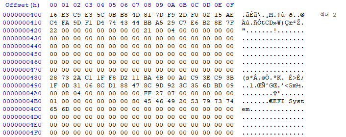 이는 앞 섹터에 존재 하는 GPT Header와 Partition Table이 손상이되면 백업 용도로 사용하려고 놔둔 것을 알 수 있습니다.