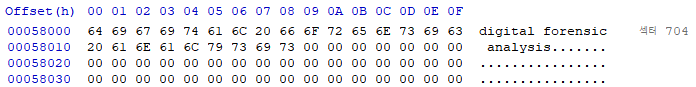 N번 클러스터의 섹터값을 구하는 방법은 많이 다뤄봤기 때문에 생략을 해보면 5번 클러스터인 704번 섹터에 가보면 파일 내용을 확인 할 수 있습니다.