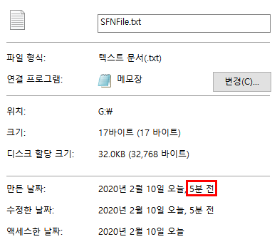 하지만 실제 폴더의 속성을 확인해 보면 만든 시간이 하루가 지나지 않아서 5분 전으로 나오는 것을 알 수 있습니다