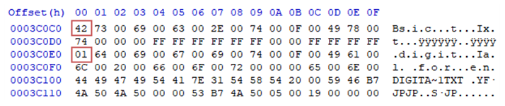 파일 명이 2바이트에 1글자씩 들어있는 것을 확인 할 수 있습니다.