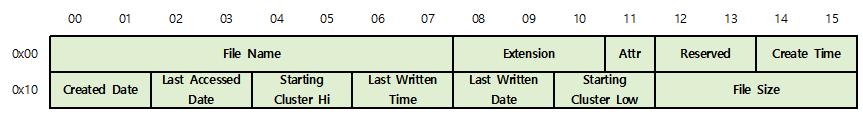 파일의 메타 정보를 저장하는 디렉터리 엔트리의 구조는 32바이트 이며 구조 먼저 확인해 보면 아래와 같습니다.