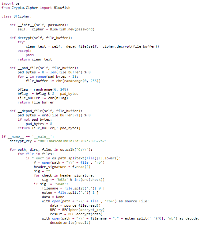 코드에서 주된 내용은 PK 시그니처를 가지고 있는 파일을 제외한 *.*_enc 파일을 BFCipher(decrypt_key) 를 이용해서 복호화후 복호화된 파일을 파일입출력을 이용 하는 것입니다.