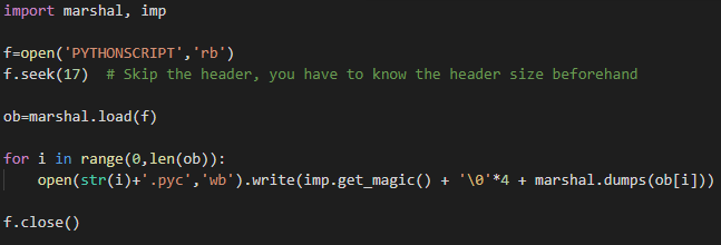 아래의 소스코드를 이용해서 PYTHONSCRIPT 파일에서 pyc 파일을 추출 할 수 있습니다.