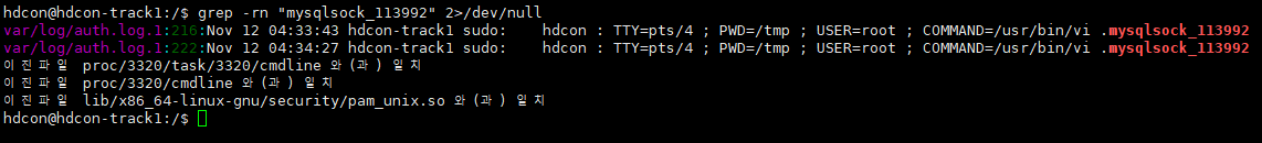 1번 질문에서 확인한 .viminfo 파일에서 /tmp/.mysqlsock_113992 파일을 확인은 했지만 언급을 안했습니다.