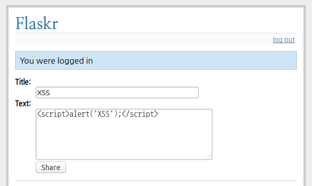 2. 사용자가 로그인하면 텍스트 전용 제목과 텍스트에 대한 일부 HTML로 구성된 새 항목을 페이지에 추가 할 수 있습니다. 이 HTML은 우리가 사용자를 신뢰하기 때문에 위생 처리되지 않았습니다.