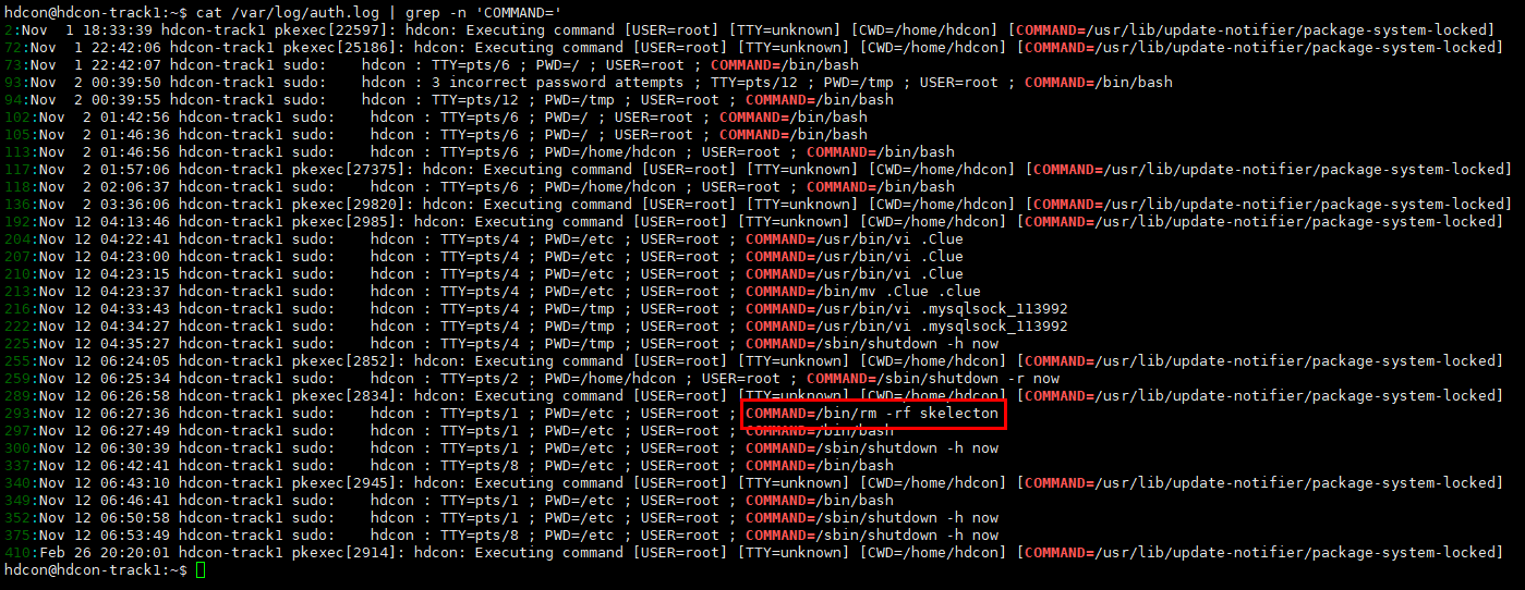 /var/log/auth.log 파일을 확인해 보면 /etc/skelecton 디렉터리를 삭제 한 것을 알 수 있습니다.