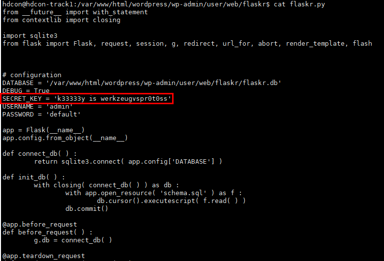 그중 /var/www/html/wordpress/wp-admin/user/web/flaskr/flaskr.py 에서 key 값을 확인 할 수 있었습니다.
