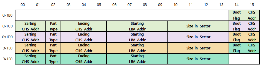 0x1B8 ~ 0x1BB 는 Device GUID(MBR Device Signature)를 의미합니다.
