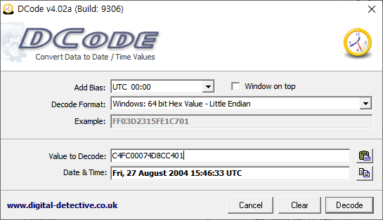 DCode.exe 프로그램을 이용해서 Unix:32bit Hex Value - Little Endian Format으로 진행하면 디코딩이 가능 합니다.